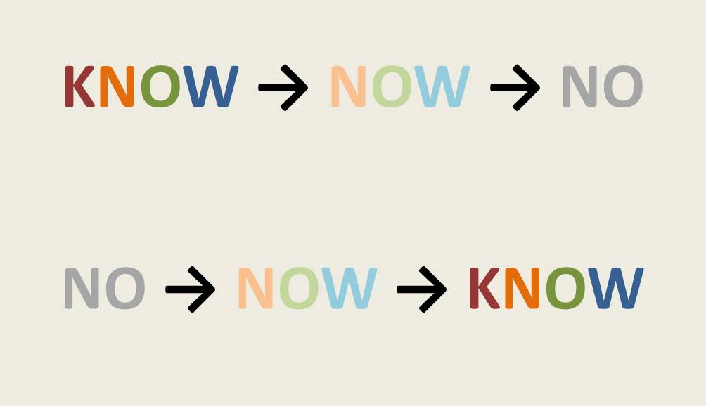 Early in the film, as the forces of evil are over-taking Pepperland, a ballistic glove called Glove chases people and smashes things with his giant fist, including the letters in the giant Technicolor word “KNOW”. First, he smashes the K to make the word “NOW”. He then smashes the W to make the word “NO”, which becomes black-and-white.