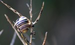 So as I checked the mail earlier today, I noticed that our entire front porch has been taken over by a huge spider web…perfectly timed for Hallowe’en, it would seem. Even better, the spider was still in the web, wrapping up it’s lunch.