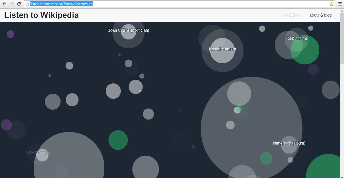 From their site: Listen to the sound of Wikipedia’s recent changes feed. Bells indicate additions and string plucks indicate subtractions. Pitch changes according to the size of the edit; the larger the edit, the deeper the note. Green circles show edits from unregistered contributors, and purple circles mark edits performed by automated bots. You may see announcements for new users as they join the site, punctuated by a string swell. You can welcome him or her by clicking the blue banner and adding a note on their talk page.